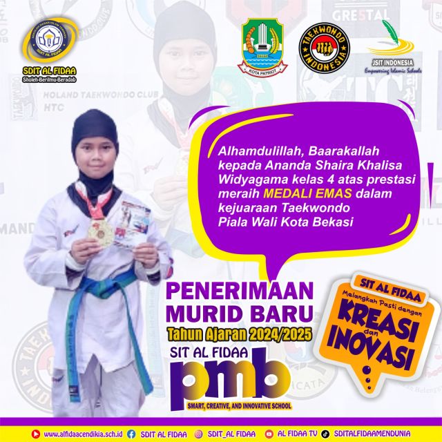 Alhamdulillah, SIT Al Fidaa Cendikia mengucapkan Selamat kepada Ananda Sahira Khalisa Widyagama kelas 4 SDIT Al Fidaa, yang meraih Medali Emas dikejuaraan Taekwondo memperebutkan Piala Walikota...